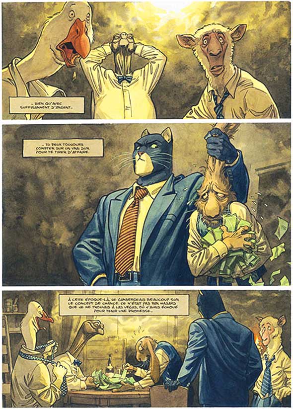 51- Blacksad de Juanjo Guarnido: La exquisitez de Juanjo Guarnido, consiguiendo plasmar un realismo tremendamente dramático dentro de una obra con personajes cartoonizados, en forma de animales antropomórficos, resulta en una auténtica, a la par que curiosa, obra maestra del cómic noir.